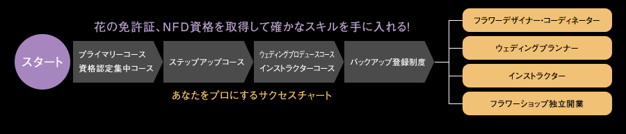 花の仕事をするにあたって、学歴や性別、年齢、身体的ハンデなど何もありません。しっかりとした技術と経験、個性と感性、そして、やる気があればデザイ ナーとして、アーティストとして、指導者として一生活躍でき、あなたのできる範囲で働き続ける事ができます。そして、それは必ず身につけることが可能で す。